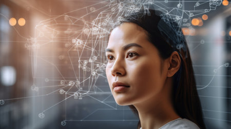 ai generated illustration about Technology and people concept. woman use AI to help work, Young Asian woman with wonder, curiosity, looking at holographic digital display