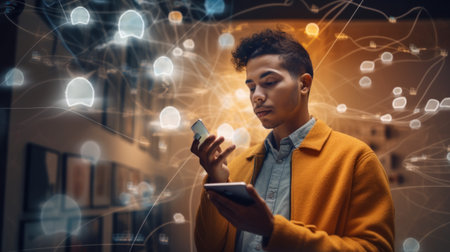 A man wearing a shirt with a geometric brain and AI symbol uses a smartphone with digital waves. Concept artificial intelligence, neural networks and mobile technology