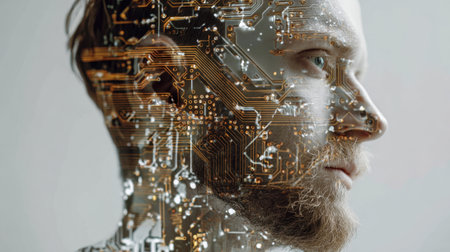A person displays a unique fusion of human traits and intricate circuit designs.