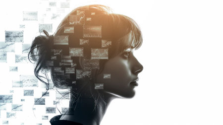 Silhouette of a woman's profile with financial charts in her head, against a white background, symbolizing analytical thinking. Generative AI
