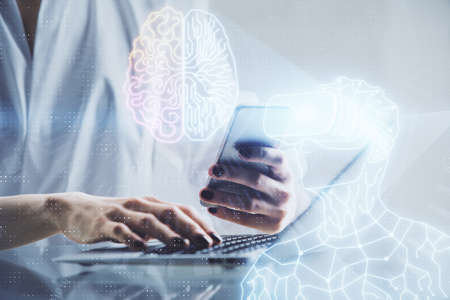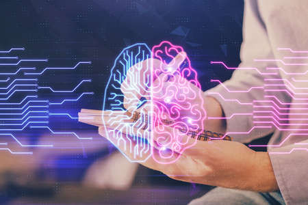 Double exposure of man's hand holding and using a digital device and brain hologram drawing. Data concept.