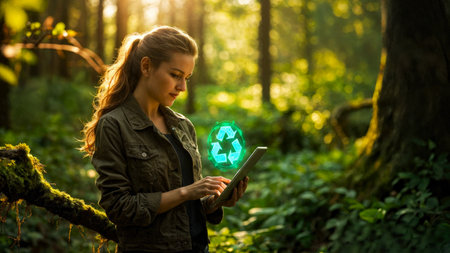 Young caucasian female using tablet for eco-friendly practices in forest setting.
