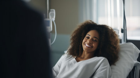 A woman is reclining in a hospital bed, grasping a cell phone in her hand, depicting a scene of modern communication and technology use