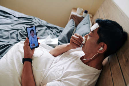 Man suffering from fever video calling his doctor asking about symptoms and complaints