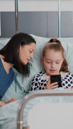 Family greeting remote friend during online videocall conference meeting using smartphone resting in bed after recovery examination. Little child suffering medical surgery in hospital ward