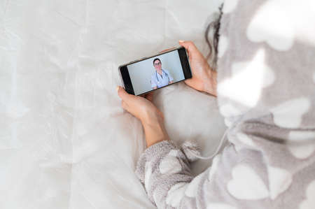 The doctor gives an online consultation to the patient. The woman in quarantine communicates with the attending physician