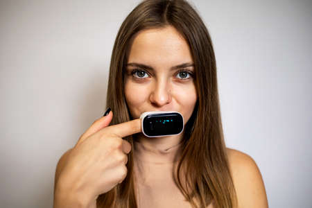 Patient women using fingertip pulse oximeter oxygen saturation meter SPO2 PR blood monitor finger on white background