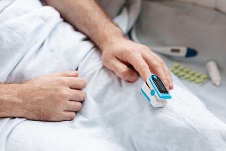Patient lying at bed and wear a pulse oximeter. View from the shoulders. Concept of determination of oxygen in the blood.