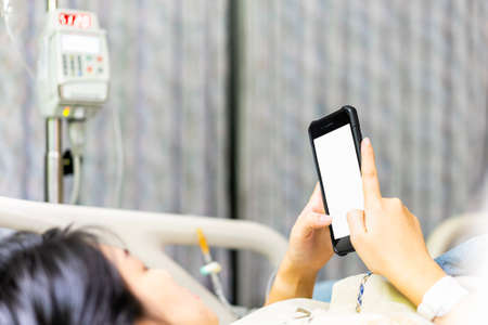women patient use telephone mobile and lie on bed in hospital during dosing of intravenous saline solution medical and vitamin selective focus at mobile phone