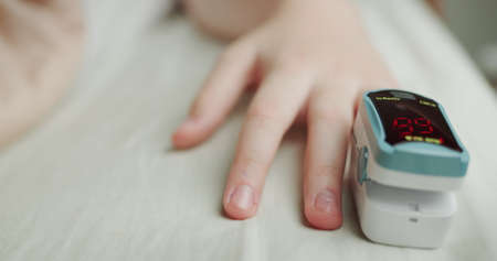 Hand of child girl with fingertip pulse oximeter on finger for examination of the lung disease,checking for infection from oxygen saturation at home,measuring heart rate (pulse)