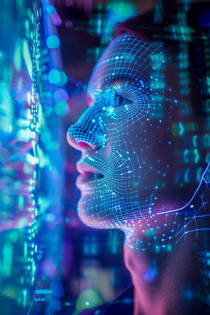 A captivating portrait of a woman with a futuristic digital projection on her face, symbolizing technology, connectivity, and innovation.