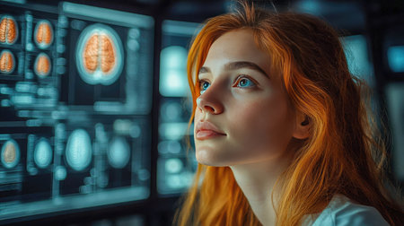 A young woman gazing thoughtfully at brain scans on a futuristic medical display. Technology and health care intersect in a modern lab environment.