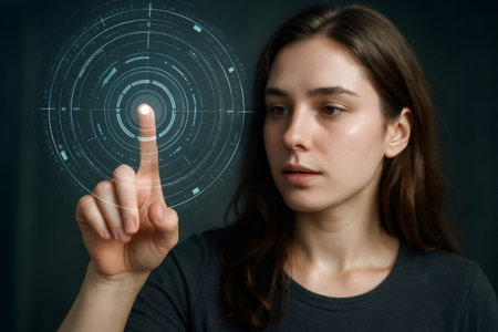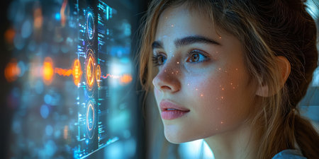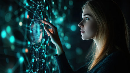 Young woman touching futuristic holographic interface, exploring virtual reality and innovation