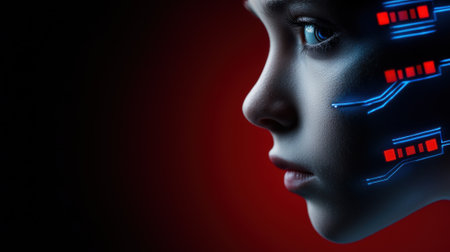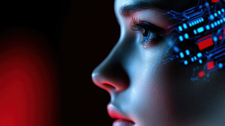 A profile portrait of a woman with intricate circuitry patterns on her face and hair. A concept of human-machine integration.