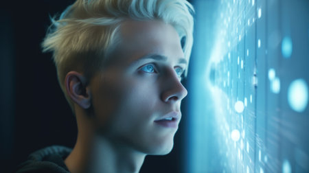 Young blonde male with wonder, curiosity, looking at holographic digital display, futuristic technology, innovation. Generative AI AIG20.