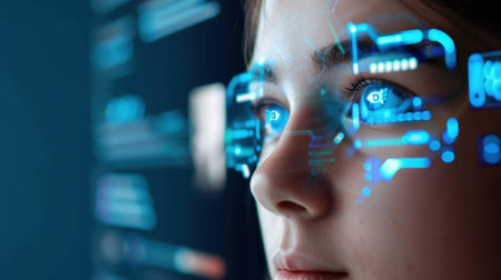 High-tech portrait featuring a futuristic female face against a blue cyber background Photo