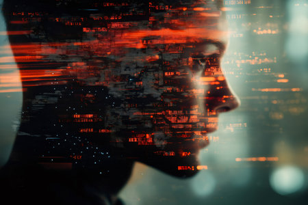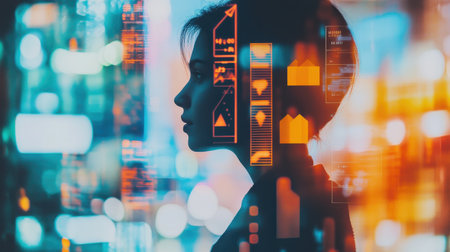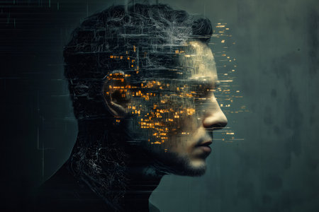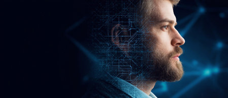 Profile of a man overlaid with a glowing digital interface, symbolizing artificial intelligence, innovation, and the integration of technology into daily life. Copy space
