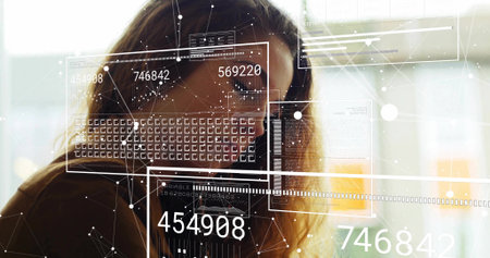 Image of network of connections over businesswoman working. communication technology, data sharing and digital interface concept digitally generated image.