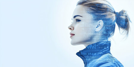 Double Exposure Portrait of Woman Merging with Digital Code, Symbolizing Technology Integration.