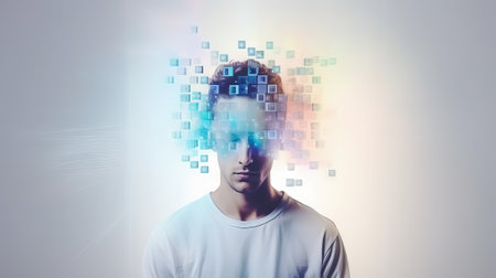 Man with head transforming into digital blocks. Concept of virtual reality, digital identity, online anonymity, internet usage, virtual presence.