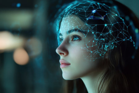 This image shows a womans profile against a bright background with digital circuitry overlaid on her face. The circuitry is abstract and appears to be a representation of the human brain. The womans expression is contemplative and suggests a connection between technology and human thought.