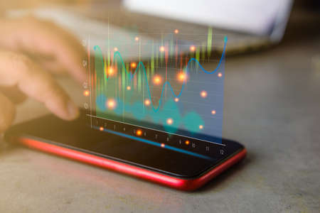 A man analyst in the office working with smartphone, Data forecast graph hologram to analyze market behavior, typing phone.