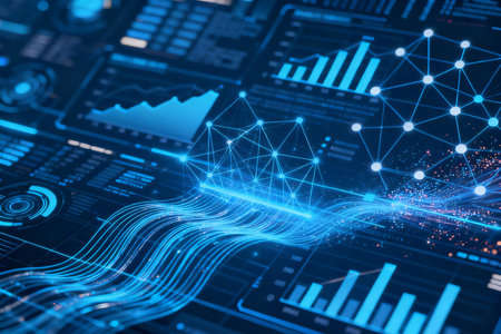 Explore a modern data interface depicting vibrant graphs and charts. This futuristic design showcases digital analytics and insightful visualizations for business analysis.
