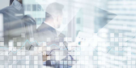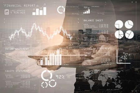 Double Exposure Image of Business and Finance conceptual - Businessman with report chart up forward to financial profit growth of stock market investment.