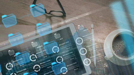 Intelligence (BI) and business analytics (BA) with key performance indicators (KPI) dashboard concept.Coffee cup and Digital table dock smart keyboard,eyeglasses,stylus pen on wooden table.