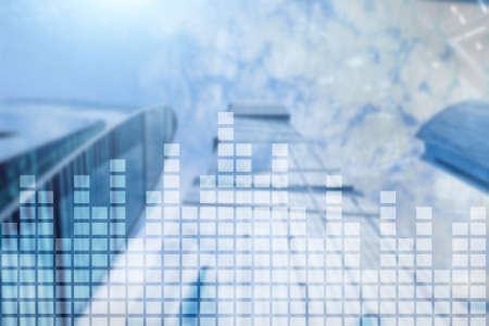 Double exposure of abstract virtual statistics data hologram on blurry cityscape background, statistics and analytics concept