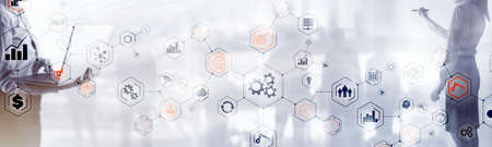 Double exposure mixed media. Diagrams and icons on hologram screen. Business people and modern city on background.