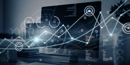 Creative visual of business big data and finance analysis on computer showing concept of statistical investment decision making methodology, fintech and financial engineering .