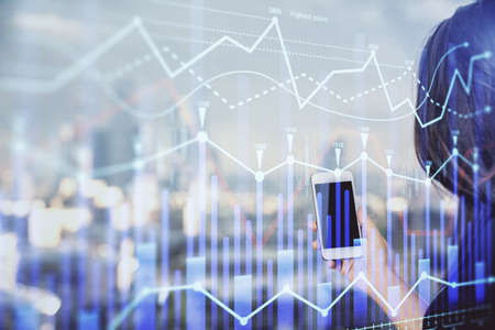 Double exposure of forex chart sketch hologram and woman holding and using a mobile device. Stock market concept.