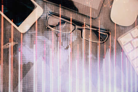 Multi exposure of forex graph hologram over desktop with phone. Top view. Mobile trade platform concept.