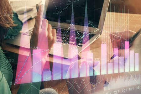 Double exposure of man and woman working together and forex chart hologram. Business concept. Computer background.