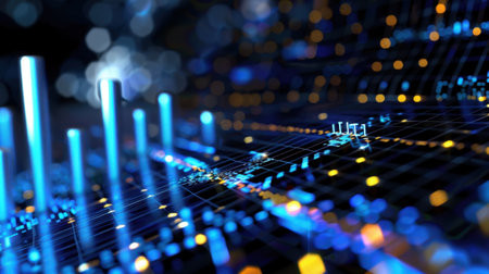 An abstract digital background showcasing glowing data points and waveform elements in vibrant blue and yellow tones, perfect for technology themes.