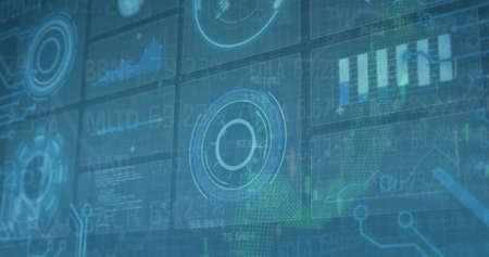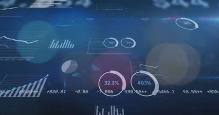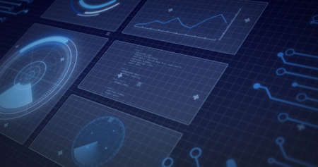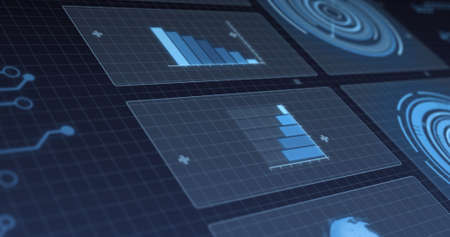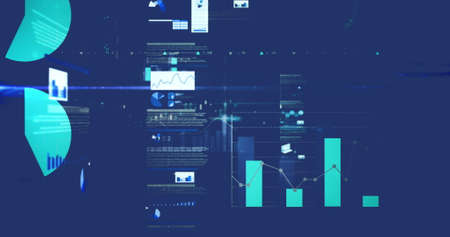 Digital image of different graphs and paragraphs moving in the screen against a blue background