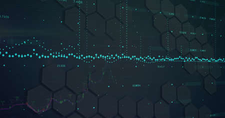 Image of financial data processing over shapes on black background. Global finances, computing and digital interface concept digitally generated image.