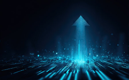 An upward-pointing arrow is depicted, constructed from digital light particles, rising from a dark, textured surface. The image showcases a vibrant display of blue light and particle effects against a black background, conveying a sense of technological advancement. Suitable for illustrating progress, growth, or innovation concepts in commercial contexts.