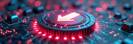 Futuristic glowing circuit board with red arrows and neon lighting. That the image is generated using AI.