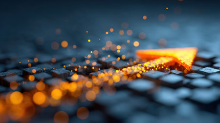 Glowing orange arrow moves forward, surrounded by shimmering particles on textured surface, symbolizing progress and direction. vibrant colors create dynamic and energetic atmosphere