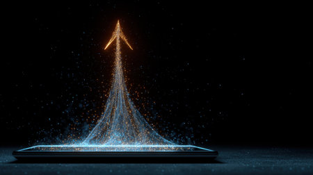 Smartphone emits vibrant, glowing arrow made of particles, symbolizing progress and innovation. dark background enhances luminous effect, creating sense of excitement and potential