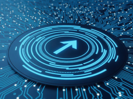 A close-up view of a digital circuit board with an illuminated upward arrow at the center, surrounded by intricate patterns of blue and white lines.