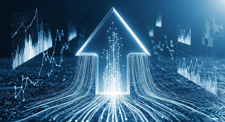 Abstract digital arrow moving upward, symbolizing progress and growth in technology and data analysis, with glowing particles and dark background creating futuristic atmosphere