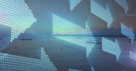 Pointing LED-style arrows floating over sea at dusk, highlighting small boat left and craft right. Seascape, tranquility, dusk, silhouette, navigation, digital art, futurism