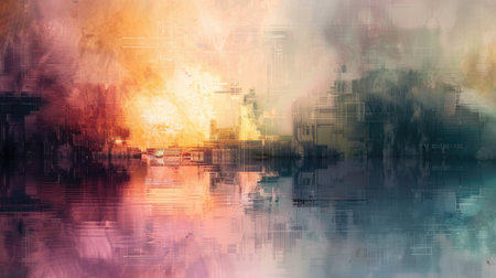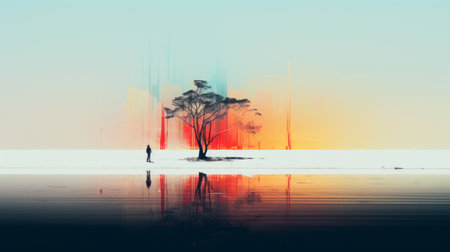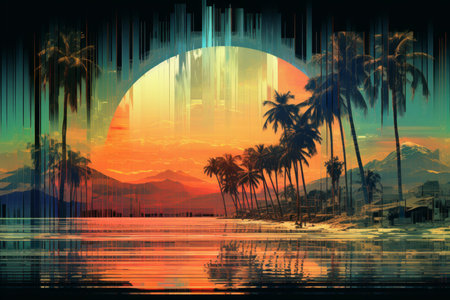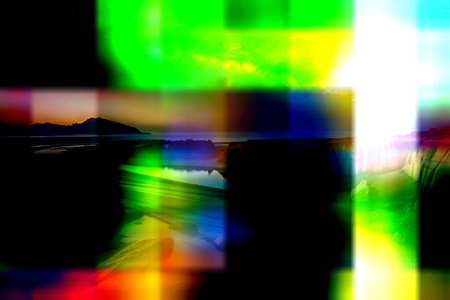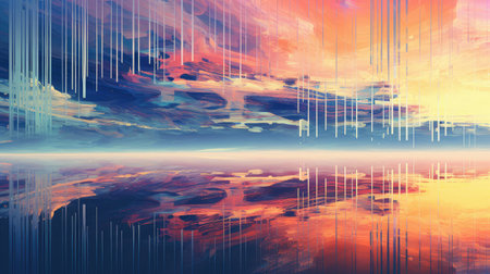 This artwork features an abstract landscape with vibrant colors and digital distortion. The serene water reflects a colorful sky filled with bright hues.