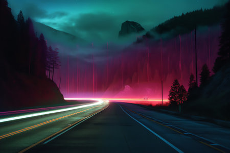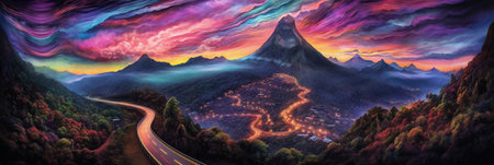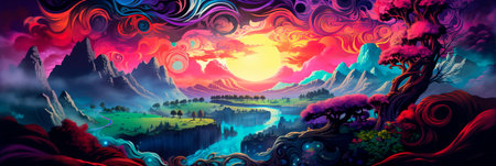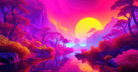 Landscape designed with vibrant neon colors, abstract and dreamy design. Ai generated.