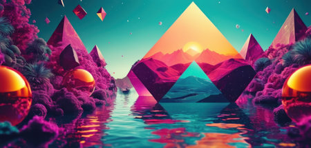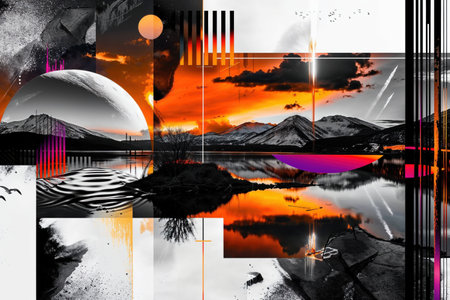 Abstract Digital Collage with Sunset Reflections and Geometric Shapes in 80s Retro Style