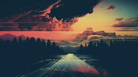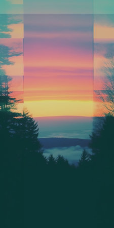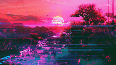 Distorted digital landscape showcasing glitch art with natural elements at dusk