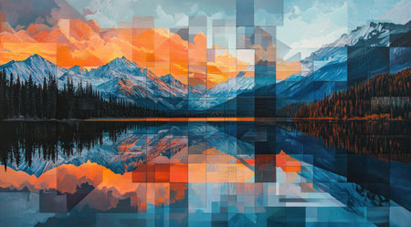 A large, multi-panel painting of the Alaskan mountains at sunset, with a lake reflecting their silhouettes. The colors in the sky and on top of the mountain range should be a gradient from warm oranges to cool blues. In the foreground is an abstract geometric pattern made up of square shapes that resemble glass or mirrors. These shapes reflect the scene of mountains, water, clouds, trees, and buildings, creating a layered effect that enhances depth and perspective. --ar 128:71 --v 6.1 Job ID: 379ab97b-63c6-4eeb-ae2f-6cb56191ac18